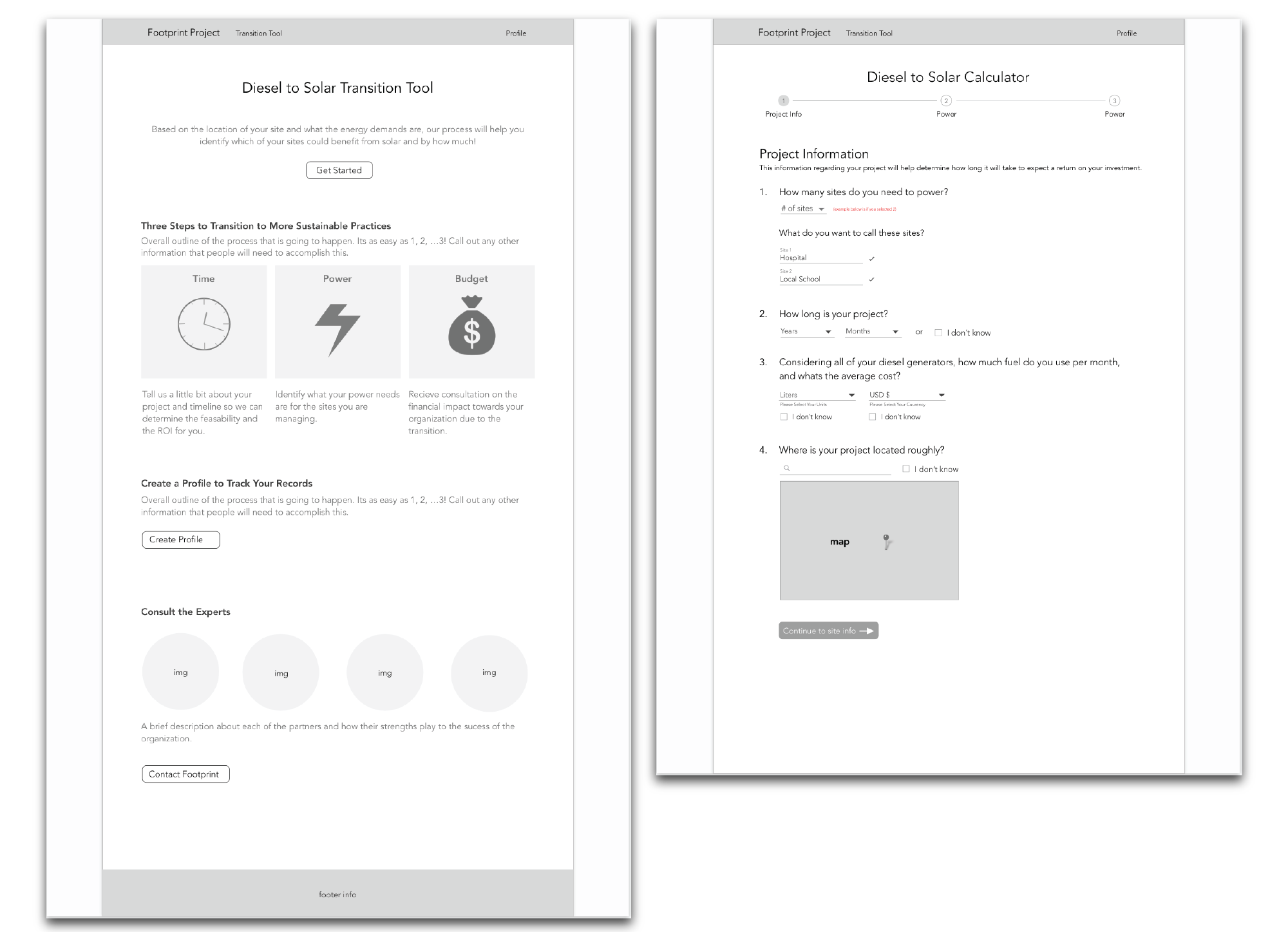 Based on our research coupled with the ease of use of the new designs for the calculator we provided, Footprint Project reached out again and we were given the opportunity to create another set of wireframes that focused on diesel and estimates of power requirements - information that we did not have before but became obvious when we had time to re-evaluate how the online calculator aligned with the strategy of the company.